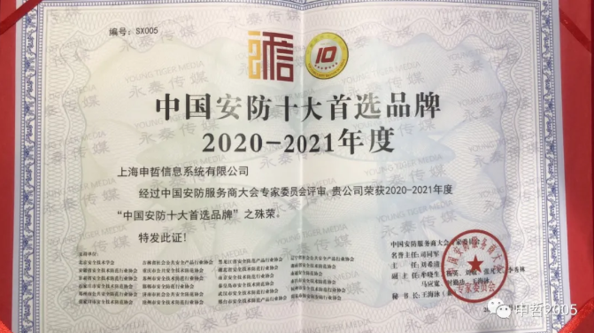 2020年10月20號,第十三屆100家誠信品牌安防供應商頒獎盛典在北京市臨空皇冠假日酒店順利召開,上海申哲信息系統有限公司憑借其在門禁及出入口控制系統行業的優異表現,再次榮獲“中國安防十大**品牌”殊榮。